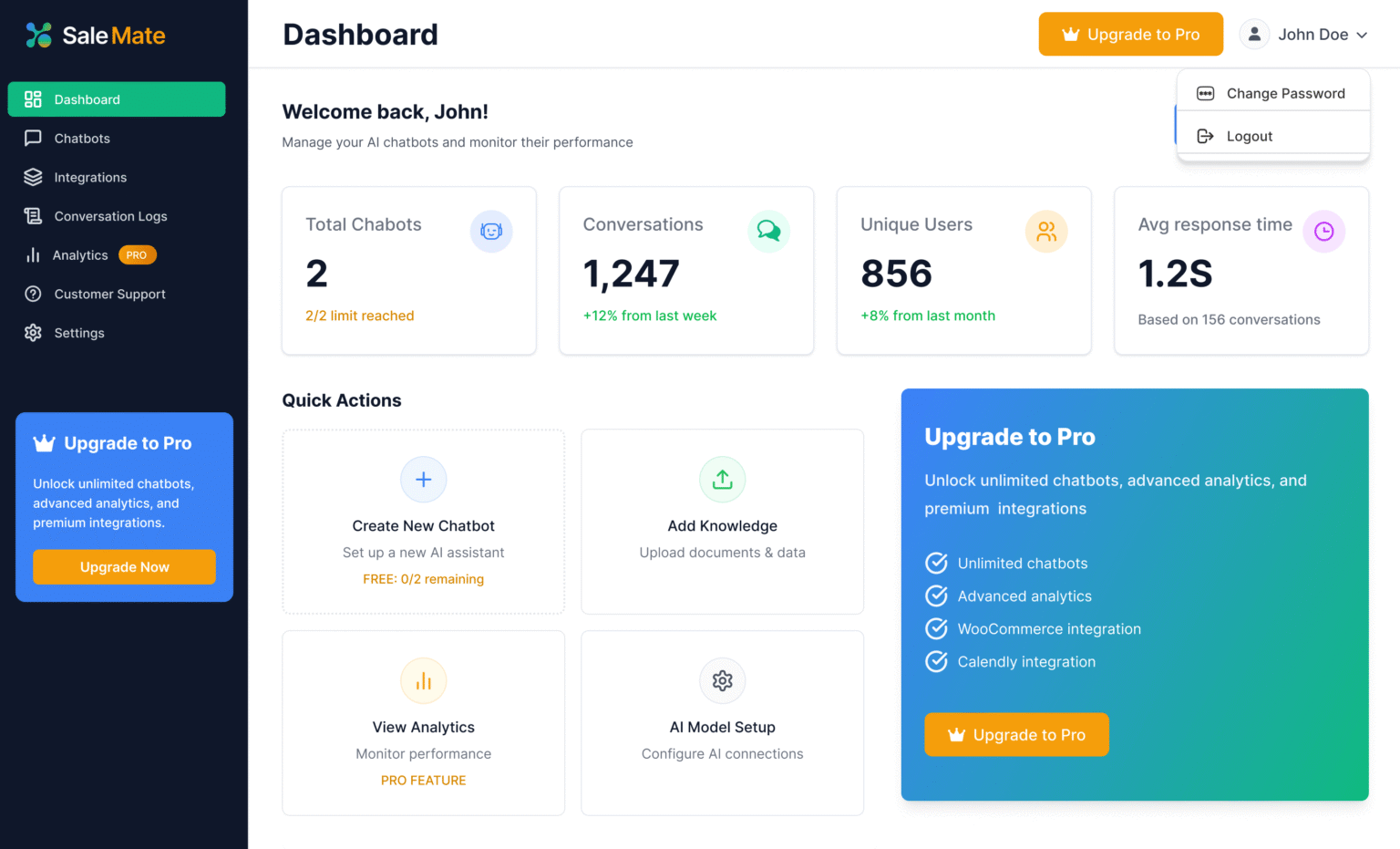Sale Mate helps businesses improve sales by converting website visitors into customers. It responds to customers instantly, reduces support delays, and prevents lost leads caused by slow replies. With its AI-powered chatbot, Sale Mate answers questions 24/7, guides users through your services, and can share your Calendly link so customers can schedule meetings instantly when needed.